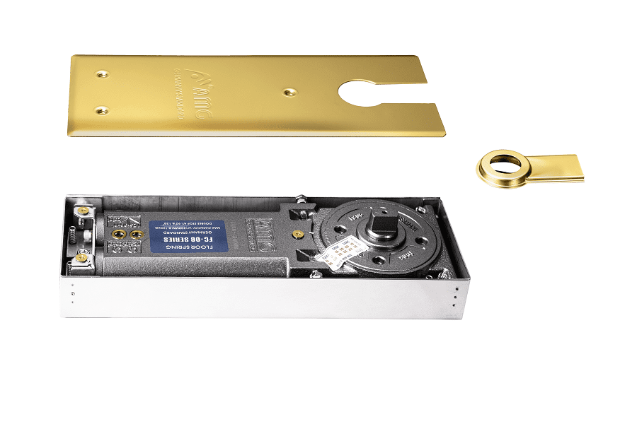 Bản lề sàn cửa thủy lực AMG mạ vàng PVD cao cấp FC06Gold được mạ vàng trên dây chuyền công nghệ Germany tạo lên sự sang trọng và bền bỉ của bộ cửa.